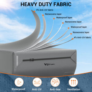 - Windproof Straps & Ventilation: Vigorvan RV cover is designed with kinds of windproof straps. There are 3 windproof straps across the RV bottom to fix the travel trailer cover. There are also each 2 windproof straps equipped on the RV front side and rear side. 2 Extra 42FT windrproof straps can circle around the whole RV body to against wind. 15 Air vents on cover can reduce wind stress. You just need to tie down all straps to against wind!