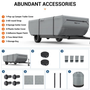 - What You Will Get: The folding trailer cover fits up to 8′-10′ (134″L×86″W×43″H). Please measure before purchasing. There are also abundant accessories in the package: Gutter Covers ×8, Repair Patches ×2, Windproof Straps ×2, Throwing Stick ×2, Storage Bag ×1. Vigorvan provide 3 years warranty, please feel free to contact us if you have any questions about camper cover.