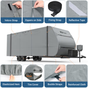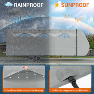 - Durable Material: There are 7 layers of top fabric and 3 layers of side fabric. The RV cover is made of non-woven fabric mixed with waterproof membrane and anti-uv compositions, which is heavy duty and durable. The travel trailer cover will provide strong full protection for your RV.