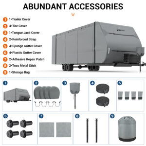 - What You Will Get: The travel trailer cover fits up to 24′-27′ (330″L×100″W×96″H). Please measure before purchasing. There are also abundant accessories in the package: Tire Covers ×4, Gutter Covers ×8, Repair Patches ×2, Windproof Straps ×2, Tongue Jack Cover ×1, Throwing Stick ×2, Storage Bag ×1.Vigorvan provide 3 years warranty, please feel free to contact us if you have any questions about travel trailer RV cover.