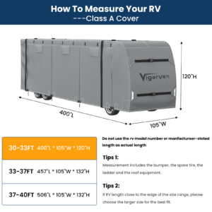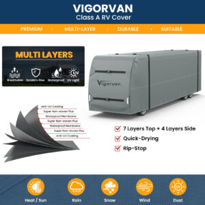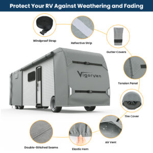 - 【Upgraded Anti-UV & Waterproof】VIGORVAN RV Covers are constructed of high-density fabric material with inner waterproof PU coating, our 600D camper cover outperform other rv trailer cover in the market in waterproof with 700mm water column test. Each sides are designed with air vents will provide maximum protection against the elements of rain and snow, can effectively keep the RV dry at all times. Recommend for using in rainy and windy areas
